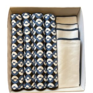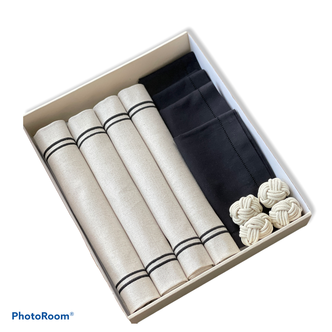 4 adet keten-pamuk 35x45cm amerikan servis, 4 adet keten-pamuk peçete ve 4 adet örgü peçetelikden olusmaktadir.