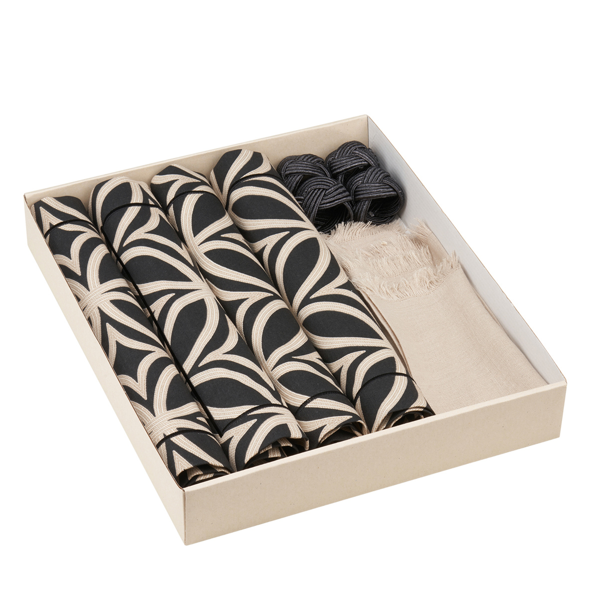 4 adet 45×35 cm koton yikanabilir amerikan servis, 4 adet peçetelik, 4 adet keten 35×35 cm peçete.