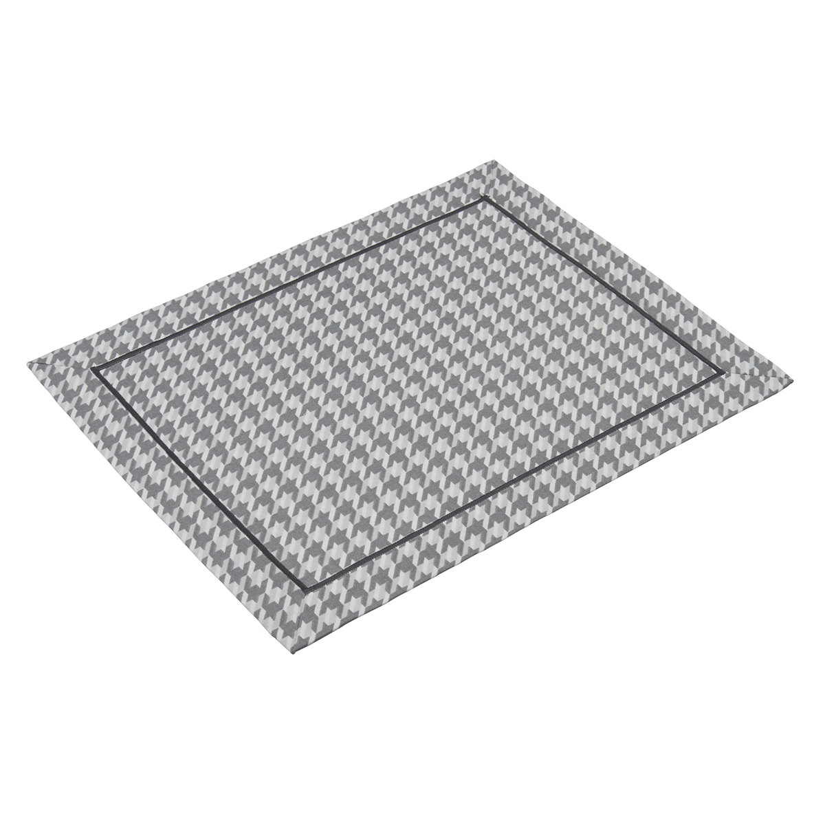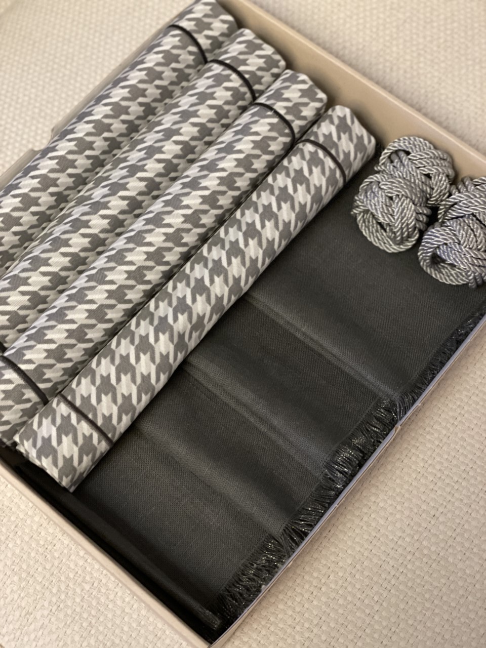 4 adet kaz ayağı desenli pamuk Amerikan servis, dört adet keten peçete, dört adet peçetelik yer almaktadır.